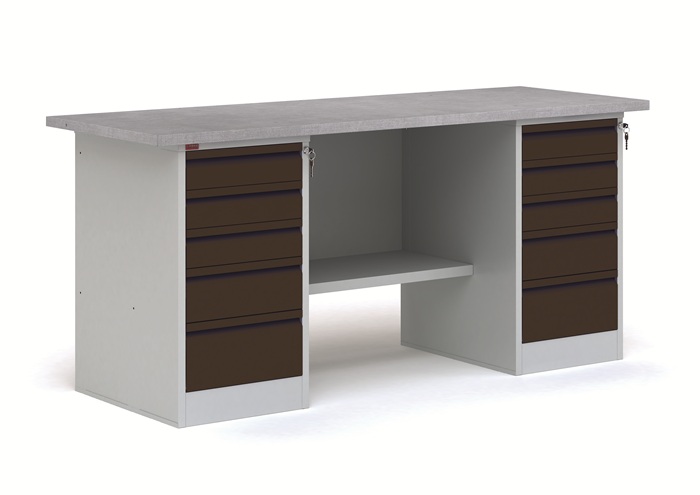 Металлические слесарный верстак ВП-6Т/1,9 черный представляет собой рабочий стол для ручной обработки металлических, деревянных изделий, а также предметов, выполненных из других материалов. Металлический верстак используется в мастерских, гаражах, автосервисах и в других рабочих зонах. Он являются основой, как небольшого промышленного производства, так и крупного предприятия. Допустимая равномерно распределенная нагрузка на верстак - 1000 кг, на полку верстачную - 40 кг, на выдвижной ящик - 30 кг. В комплект верстака ВП-6Т/1,9 черный входит: столешница СТ-1,9 из МДФ, покрытая оцинкованным листовым металлом, комплект К-3/1,9 (стенка задняя металлическая), две тумбы Т-2Т с пятью выдвижными ящиками на телескопических направляющих. Тумбы закрываются центральным ключевым замком. Дополнительно на верстак можно установить перфорированный экран соответствующего размера, аксессуары на экран. Цвет: верстак - серый Ral 7035, лицевая панель ящиков и двери - черный муар Ral 7021. Гарантия 1 год. Срок службы 10 лет